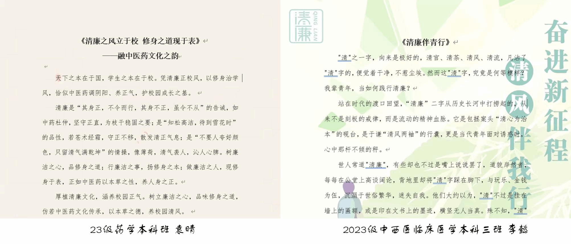 本网讯(文/图张启航)为使廉政文化建设深入校园,营造风清气正的育人环境,引导广大青年学生树立廉洁自律的意识,筑牢拒腐防变的思想防线,2025年7月31日到2025年8月7日本草书院举办了“笔述清廉志,青春扬正气” 线上征文比赛。此次活动由远志医药文学社承办,吸引了众多文学爱好者的热情参与,共收到了27份活动作品。