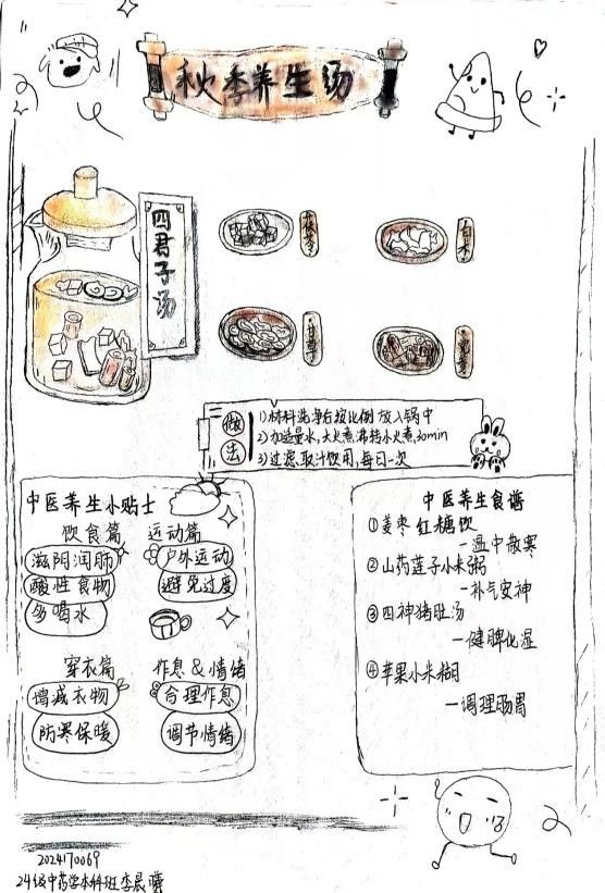 秋风送爽,亦带来干燥与温差变化。活动聚焦秋季养生主题,鼓励学生将中医药知识与日常生活深度融合。参与者们发挥创意,通过电子手账或手绘记录等形式,精心设计了个性化的养生手账。活动发布后,同学们积极响应,通过电子手账或手绘拍照等形式,记录下自己的秋季养生计划与实践。作品中不乏对食材功效的标注、穴位按摩的打卡、情志调节的提醒,充分体现了中医药“治未病”的养生理念。