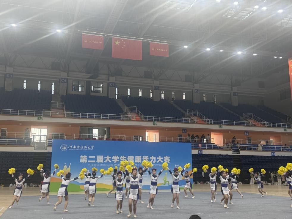 比赛现场气氛热烈,伴随着明快的音乐节拍,本草书院的参赛队员们身着紫白配色的啦啦操服、手持明黄色花球依次登场——伸展、跳跃、旋转的每一个动作都精准有力,队形变换的每一次衔接都默契流畅。灵动姿态里的蓬勃朝气将青春活力与啦啦操的韵律美展现得淋漓尽致,引得现场观赛师生阵阵喝彩,最终斩获比赛第二名的荣誉。
