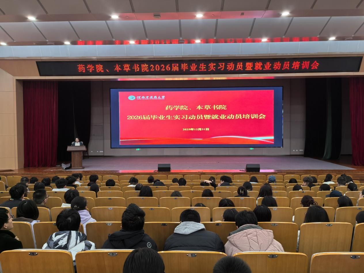 本网讯(文/姚柯杉 图/田思帆)为扎实推进2026届毕业生实习工作,精准为毕业生提供实习指导服务,确保毕业各项工作有序衔接,药学院、本草书院于2025年12月31日举行2026届毕业生实习动员暨就业动员培训会。药学院副院长朱鑫、本草书院兼药学院副院长高巍、药学院科研与学科建设办公室主任张飞,药学院教师、本草书院毕业班辅导员和2026届全体毕业生参加本次培训会。会议由高巍主持。