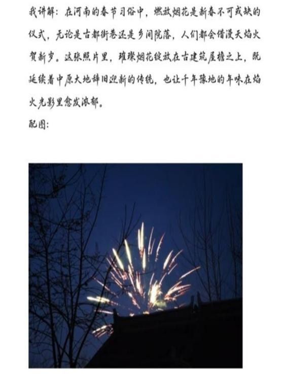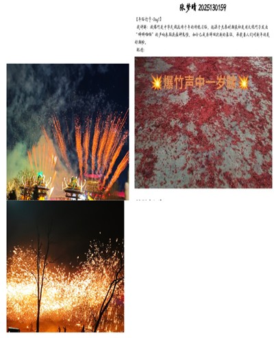 本次活动以线上形式展开,以讲述年俗、分享年味为核心,鼓励同学们从身边的传统习俗出发,用文字讲述扫尘、祭灶、守岁、压岁钱等传统年俗的寓意与讲究,用镜头定格春联、饺子、花灯、团圆家宴等温暖新春瞬间,打捞记忆深处的年味碎片,让古老的年俗文化在青春分享中重焕生机。其中,2025级临床医学本科班崔贺童的作品以色彩斑斓的图片和详细的文字描述展示了春节的热闹场景;2024级医学影像技术(中外合作)本科班郭欣月的作品中鞭炮、烟花让人仿佛身临其中。参与同学纷纷表示本次活动十分有意义。