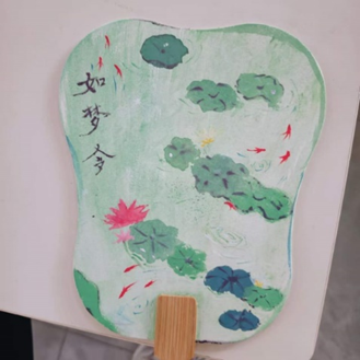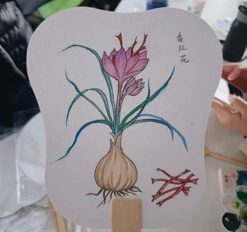 本次活动以线下形式开展,以手绘本草、墨染团扇为核心,鼓励同学们从常见药用植物出发,用笔墨勾勒金银花、艾草、薄荷等本草的雅致形态,用色彩晕染与本草相关的诗词意境,定格传统本草与水墨艺术碰撞的美好瞬间,让古老的中医药文化在笔墨创作中焕发新的光彩。其中,2024级中医学仲景二班吴若晨同学的作品以细腻手绘勾勒出番红花的球茎、花叶与入药花丝,鲜活的色彩与形态,让本草之美跃然扇面。2023级护理学保健英语本科班王姿懿同学的作品以清新笔触绘就荷塘清趣,红鲤游弋,搭配“如梦令”三字,将夏日池景的灵动与宋词意境晕染于扇面之上。参与同学纷纷表示本次活动趣味十足、收获颇丰。