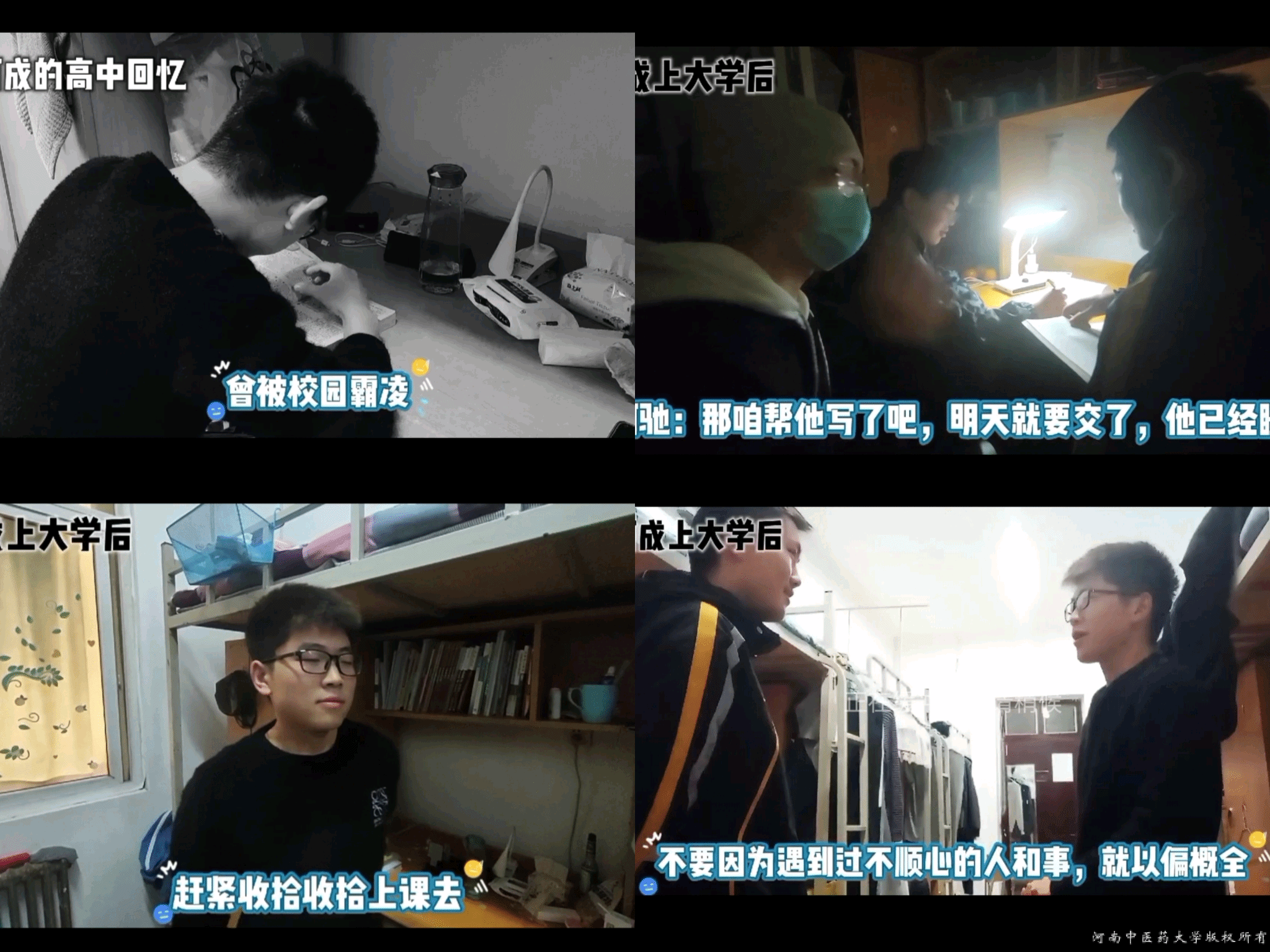 同学们围绕着“模仿”这一关键词进行作品创造,充分挖掘表演潜力,调动活动积极性,交出了一份又一份高质量的作品。同学们通过合适的服装搭配、精湛的模仿能力和新颖的表演形式,同时融入日常生活、热门词汇、专业科普等元素,给大家带来了一场场生动诙谐的表演,或创意十足、爆笑不断或扣人心弦、引人深思,将自己的台词功底和表演能力展现的淋漓尽致。其中,2020级中医学本科二班韩卫成同学的作品《这世界并没有你想的那么糟》尤为突出。短片中讲述了主人公阿成在高中受到校园霸凌,导致他进入大学后对室友产生偏见,认为室友们也会对他进行欺凌。但在室友种种暖心行动后,阿成放下偏见,融入其中。剧中人物的塑造、台词的酝酿及环境的渲染都恰到好处,其拍摄手法和文字描述值得大家深入学习。