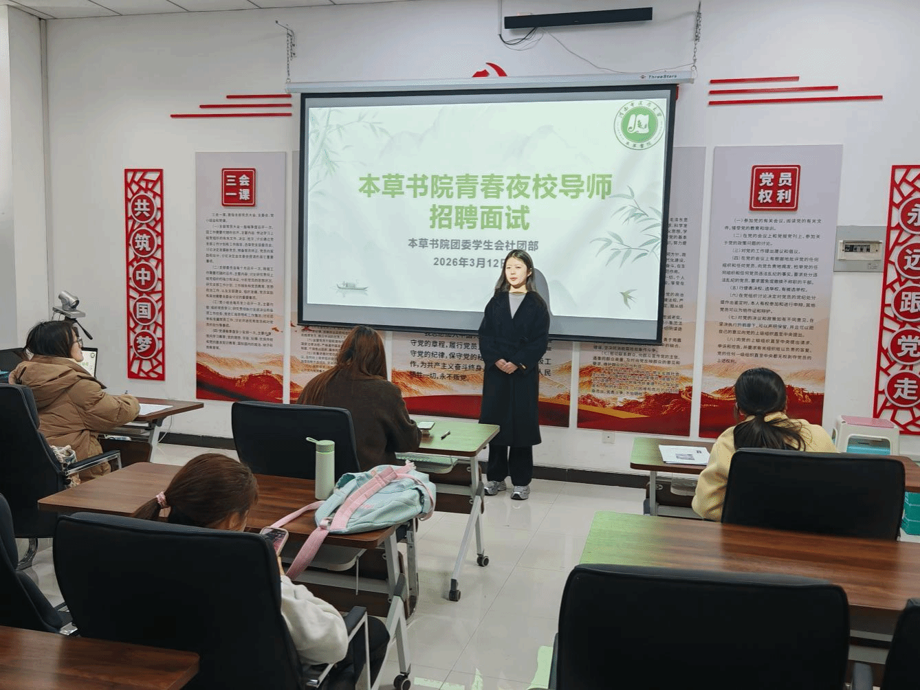 本网讯(文/王培晓 图/韩昊洋)为充实第二课堂育人队伍,促进书院五育融合发展,2026年3月12日,本草书院在六号楼116功能间开展青春夜校导师招聘面试,书院育人导师毛辛飞及应聘同学参与此次面试。