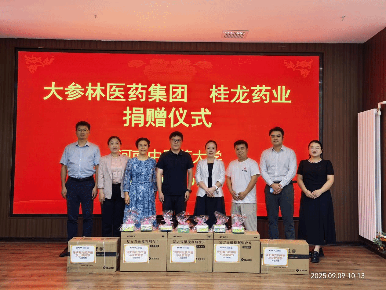本网讯(文图/高巍 朱会宇)在第41个教师节到来之际,为表达对学校教师的节日问候与支持,2025年9月9日,大参林医药集团西北大区人事总监董杰、桂龙药业河南省区经理何刚一行来我校交流,并向本草书院、药学院捐赠了药品。本草书院党委书记、执行院长刘雅琳,药学院副院长朱鑫,本草书院副院长高巍、张文举参加了本次活动。