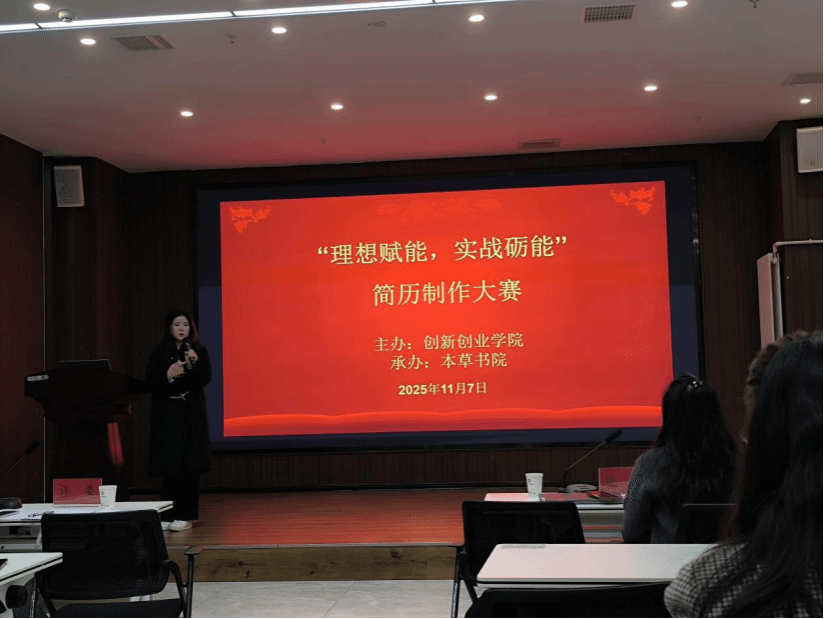 本网讯(文/靳浩楠 图/梁艳平)为进一步提升学生职业规划能力与求职竞争力,夯实就业实践基础,2025年11月7日,由学校就业创业指导服务中心主办,本草书院承办的“理想赋能,实战砺能”简历制作大赛在图书馆第一报告厅顺利举行。