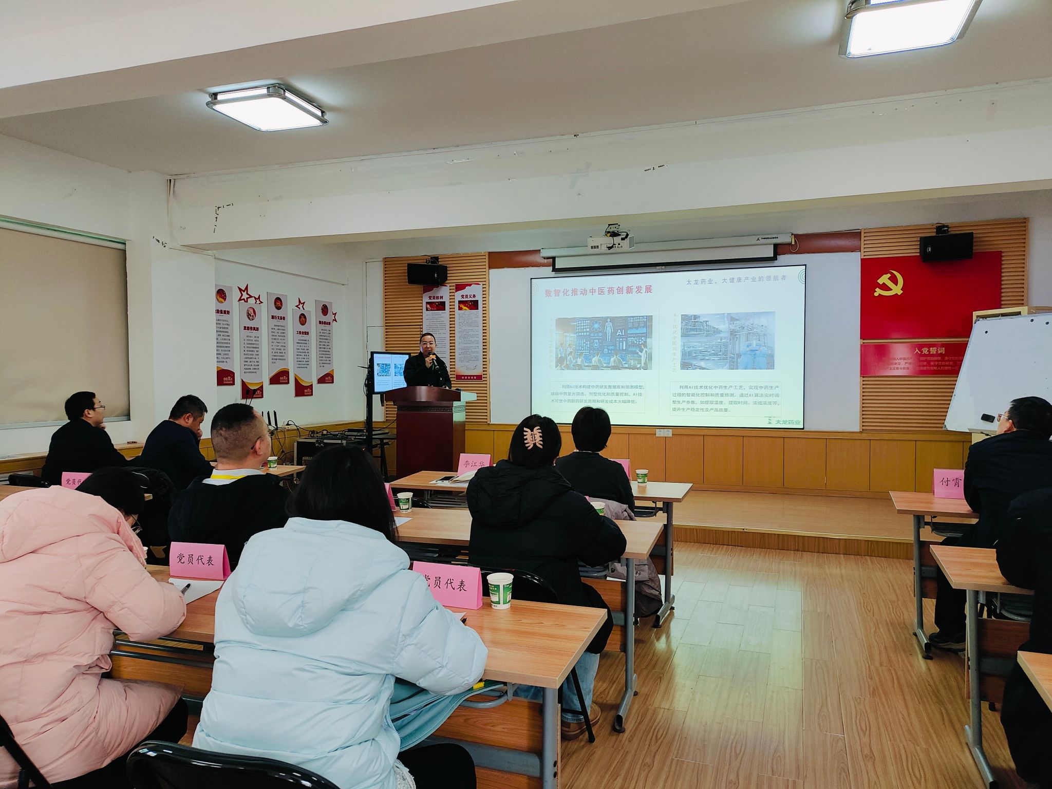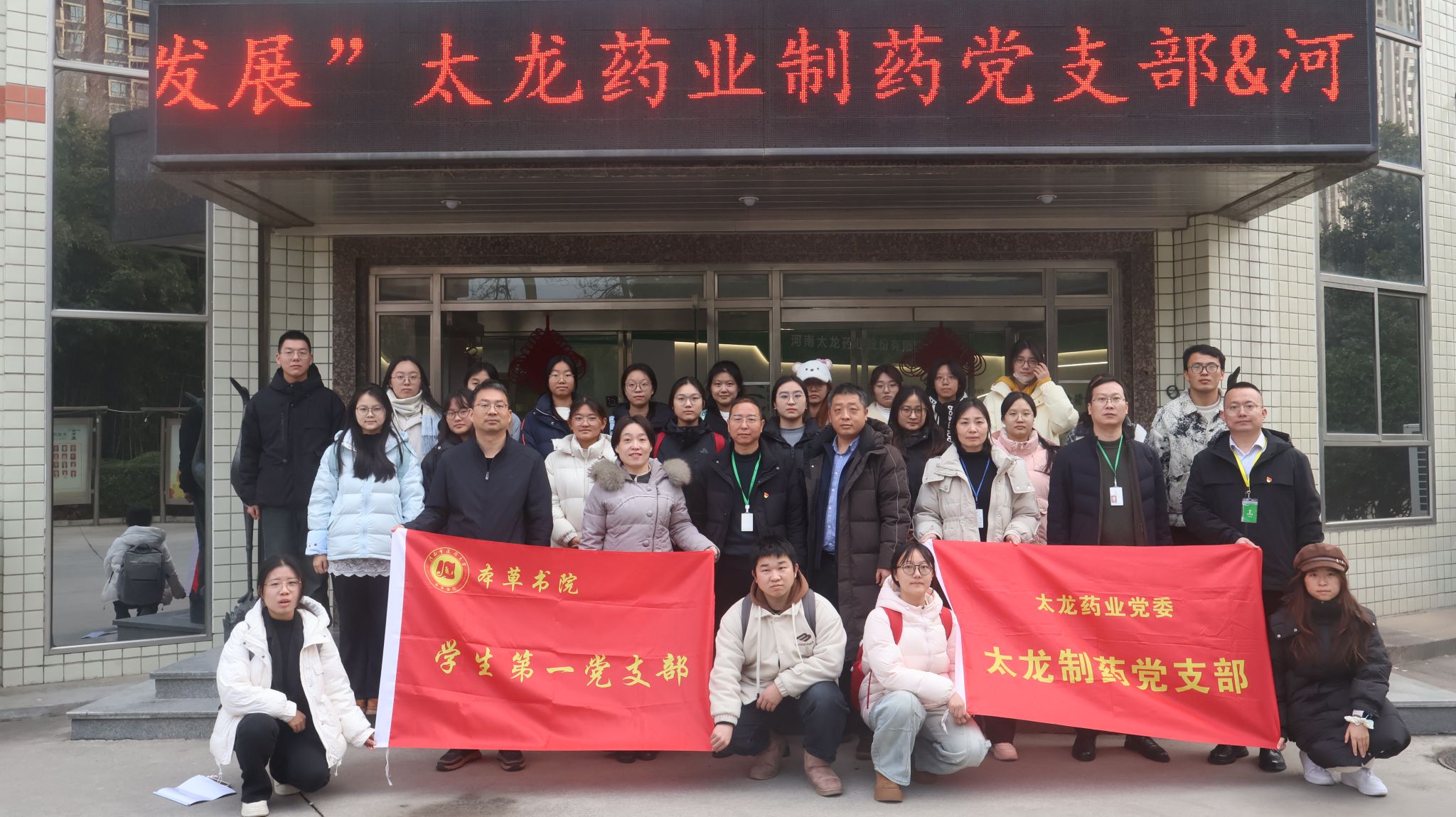 本网讯(文/武永勇 图/梅坤鹏、仝如意)为深入学习贯彻党的二十届四中全会精神,扎实推进高校党建与人才培养、行业发展深度融合,12月23日,本草书院副院长高巍、本草书院学生第一党支部书记武永勇带领学生第一党支部成员前往河南太龙药业股份有限公司,联合开展“党建引领强信念,院企同心促发展”主题党日活动。河南太龙药业股份有限公司太龙制药党支部书记、事业部副总经理李江华,党支部委员徐晓丽、畅亮等企业代表出席交流活动。