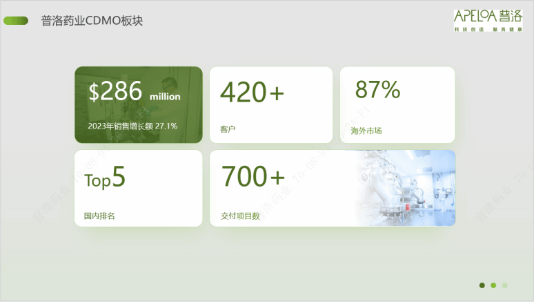 普洛药业的CDMO研发中心始终坚持以“为客户提供经济、优质、高效的一站式服务,加快新药开发及上市历程”为使命,不断提升实验室硬件及软件水平,以支持更高水平的研发项目。具备“化学合成+生物发酵”双轮驱动技术能力和“多客户、多产品”的竞争优势,CDM0业务已经实现“起始物料+注册中间体”向“注册中间体+原料药”模式的转变。