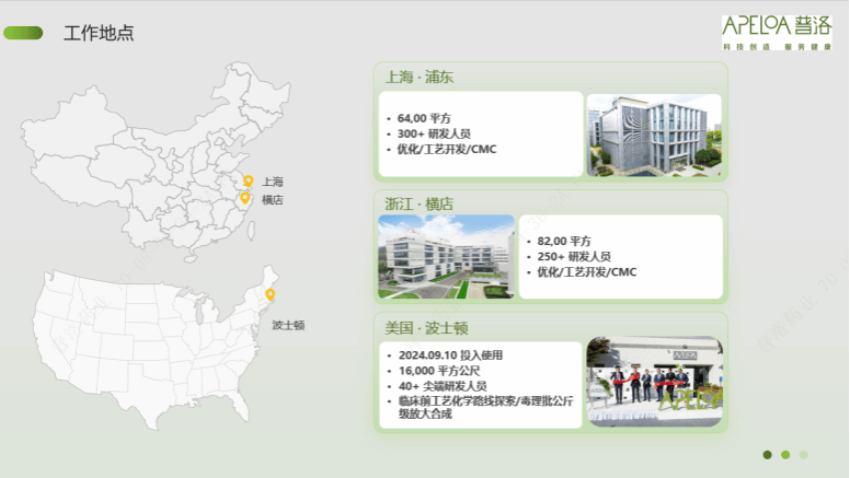 目前CDMO研发中心共有3个研发基地,分别在上海浦东,浙江横店以及美国波士顿。目前研发人员团队规模为700+,随着上海CDMO新实验楼的投入使用、横店CDMO新研发楼建设、生物研发平台的建成以及流体化学实验室、高活性物质(API)实验室、安全实验室、两个高活性药物车间、两个多功能CDMO标准化车间和四个原料药生产车间的陆续建成及运行,将会为客户提供更优质、高效的CDMO服务。